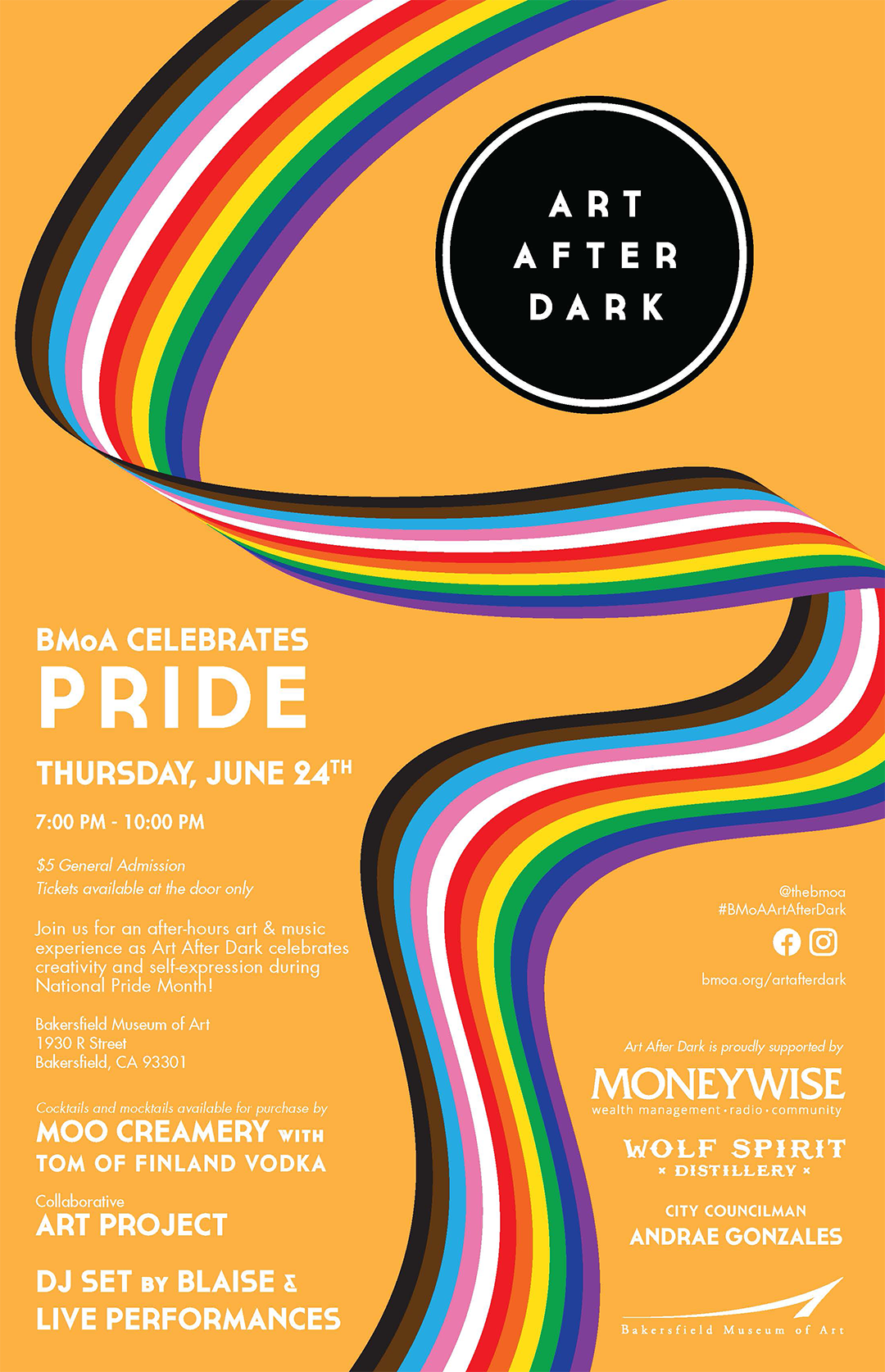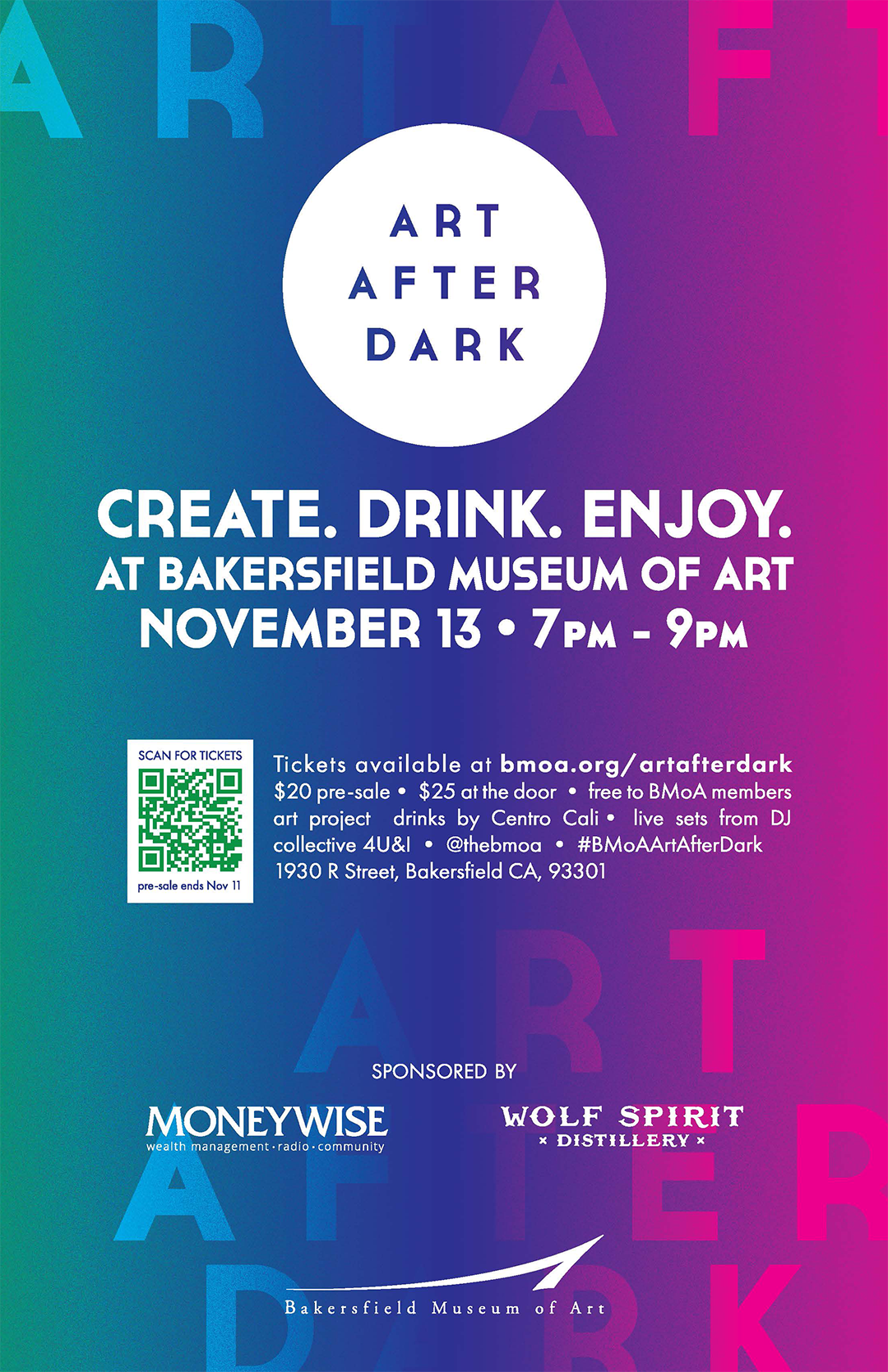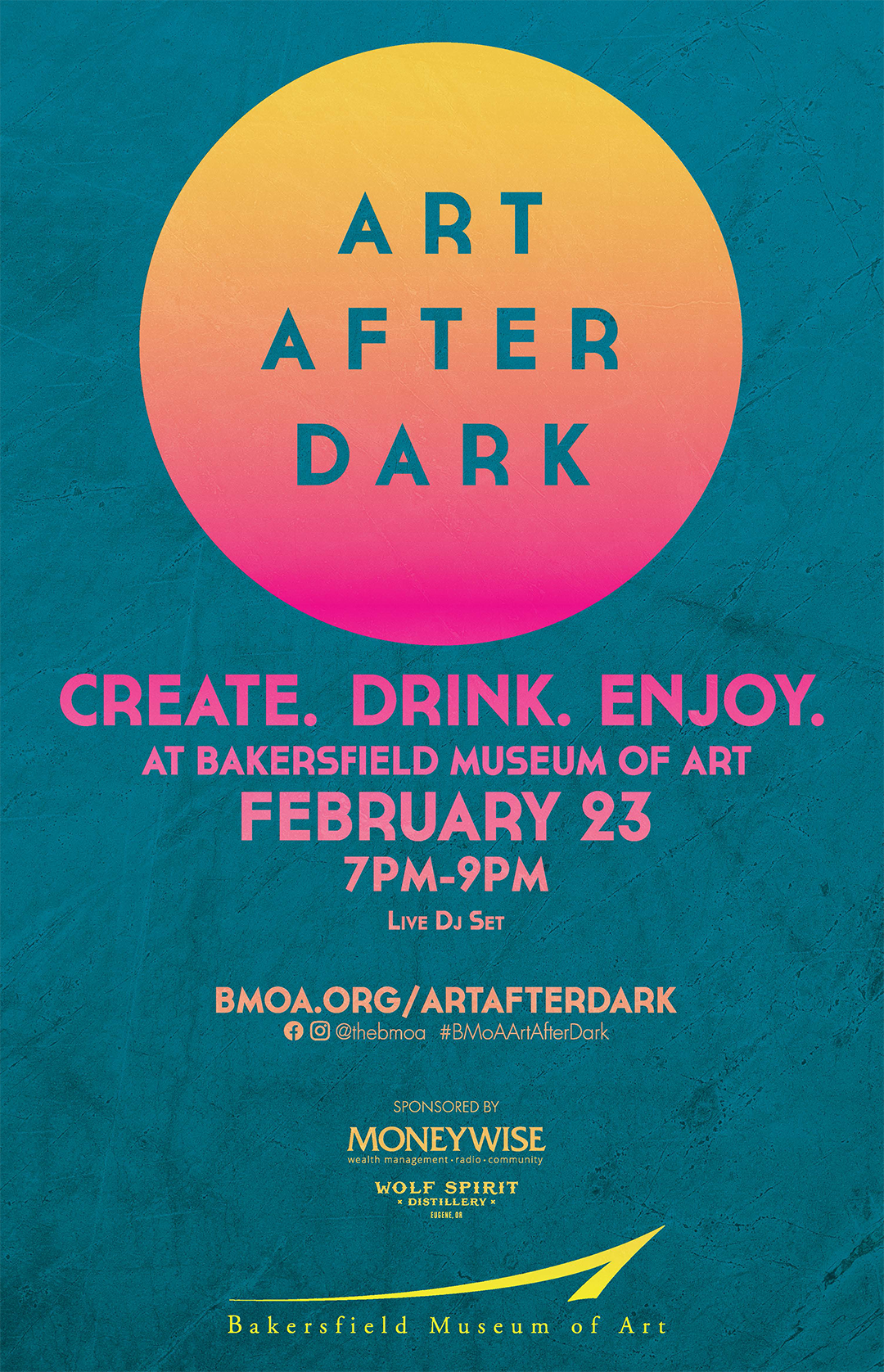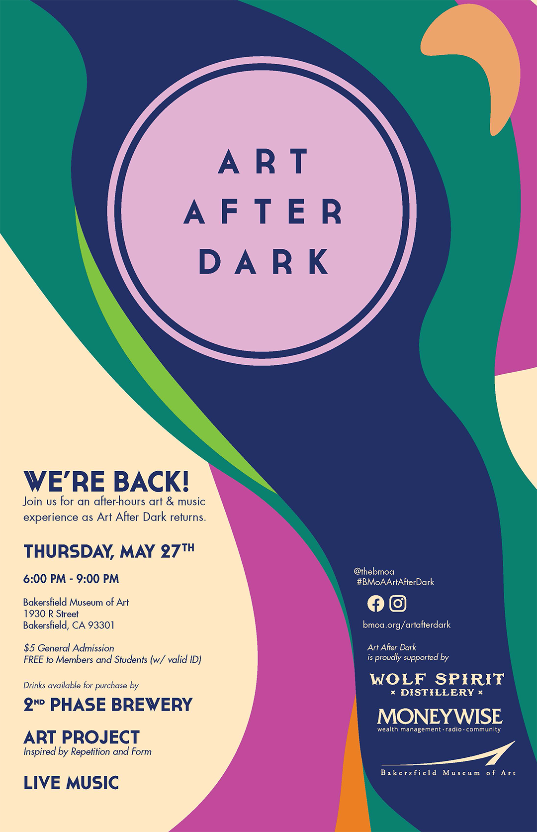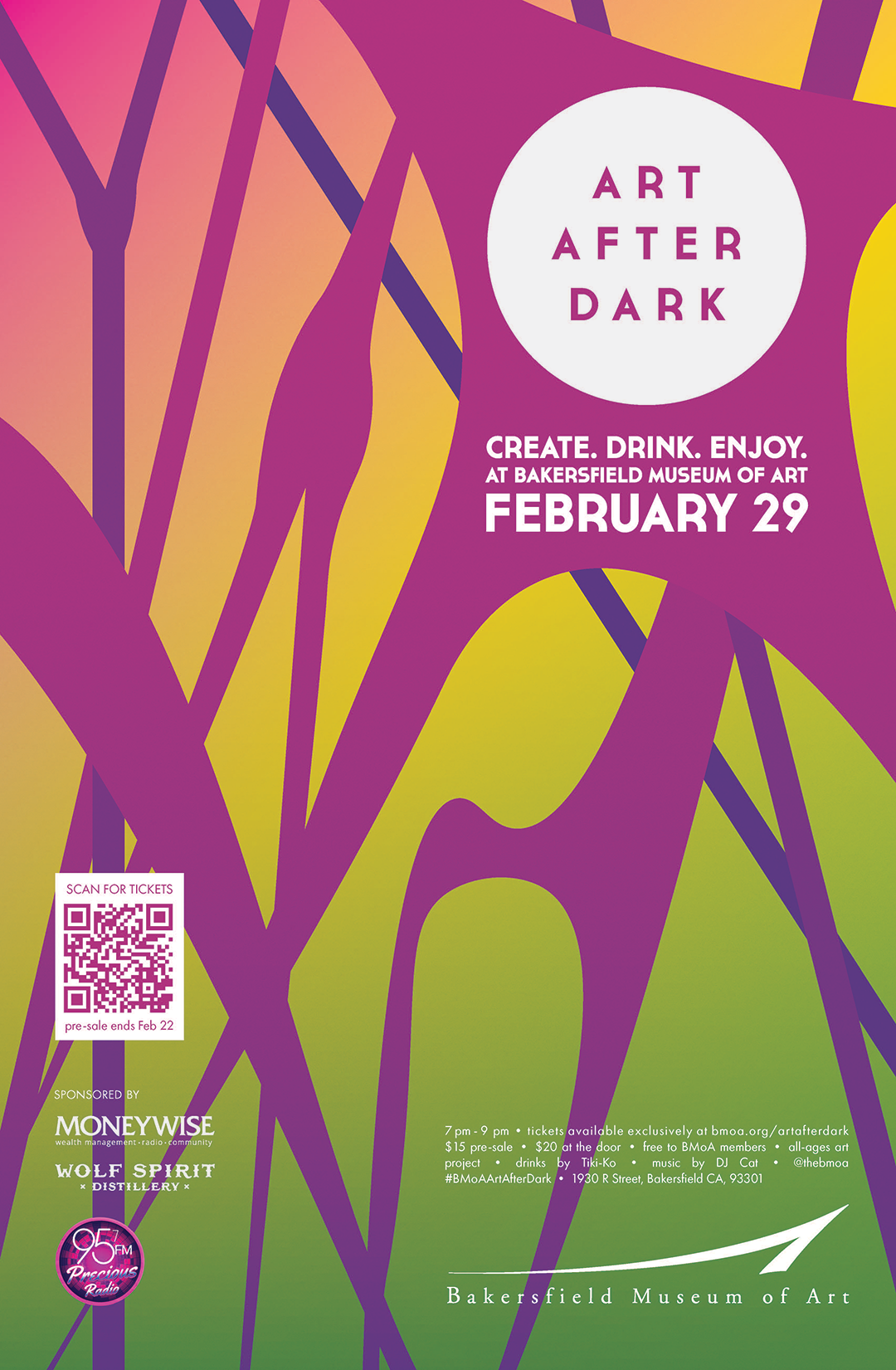 As the designer for Bakersfield Museum of Art (BMoA) it was my honor and privilege to design the visual identity for each iteration of the museum’s after-hours art experience events, Art After Dark. Each year, was a new opportunity to create a cohesive series and finding creativity within the constraints of the established brand.